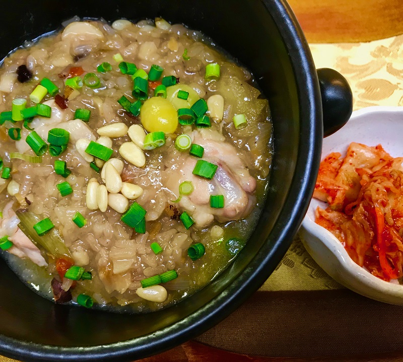 参鶏湯は韓国料理で鶏肉の中に高麗人参、もち米、松の実などを詰めて煮込んだ料理です。