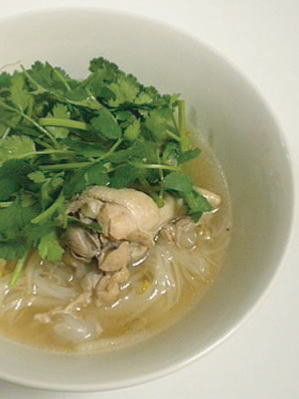 フォーを茹でてザルにあげておきます。あらかじめ、薬膳すーぷの素と水、鶏肉を入れてスープを作っておきます。