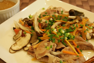 器にとりわけ、万能ねぎをふりかけ、ごまだれをかけていただく。