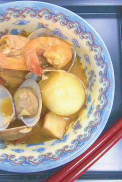 さらにペコロス、海老、あさり、白身魚を入れて火を通す。
