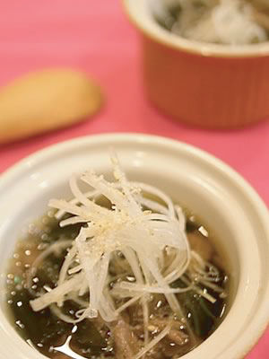 わかめ、薬膳スープを入れて煮込み、塩・醤油で味を整える。